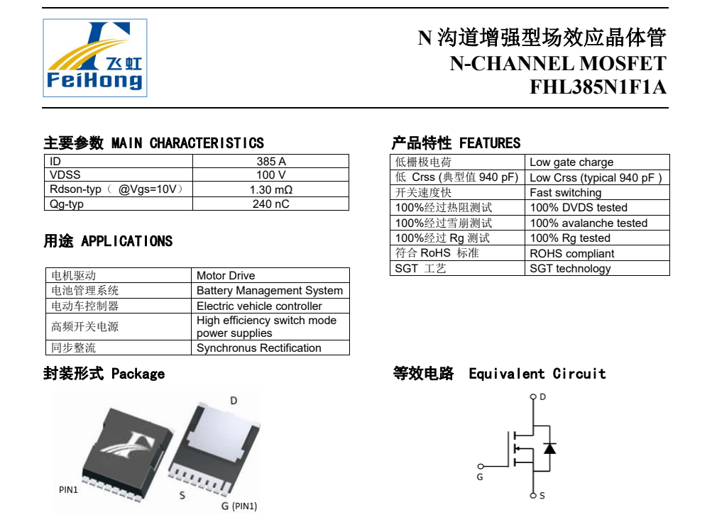 使用过飞虹这一款MOS管的电子研发工程师都了解这款优质FHL385N1F1A国产场效应管的详细参数:其具有385A、100V的电流、电压, RDS(on) = 1.5mΩ(MAX) @VGS = 10 V,RDS(on) =1.3mΩ(TYP) @VGS = 10 V,最高栅源电压@VGS =±20 V。