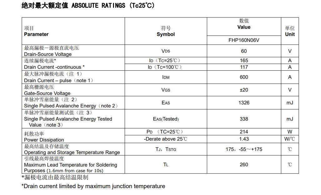 热管理是车载逆变器设计的另一核心痛点。该器件通过100%雪崩测试验证,其TO-220封装的结到管壳热阻(Rth(j-c))仅0.7℃/W,配合214W的耗散功率(TC=25℃),在85℃环境温度下仍可保持稳定工作。相比需要降额使用的进口型号,FHP160N06V在高温工况下的参数保持率提升15%,这对于空间受限的车载应用至关重要。