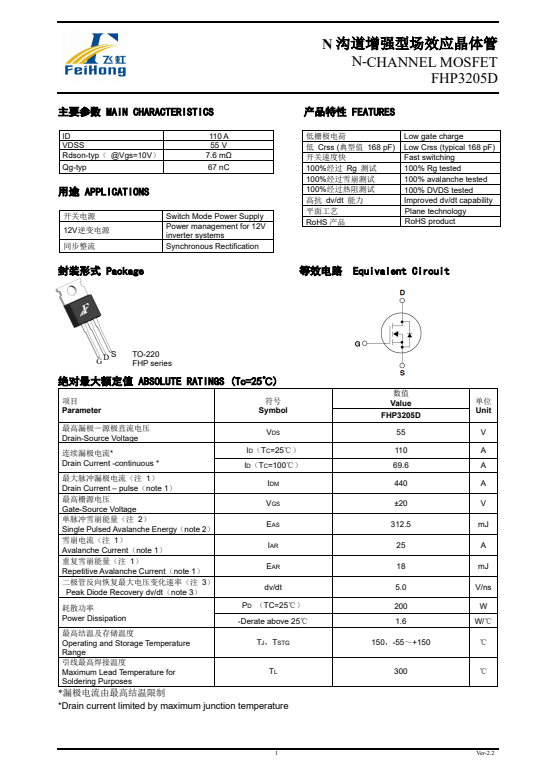 在性价比方面,FHP3205D相较于进口品牌有着20-30%的价格优势,但性能毫不逊色。其通过严格的雪崩能量测试(EAS312.5mJ),证明其在恶劣工作环境下仍能保持稳定性能。这对于要求严苛的工业应用场景尤为重要。