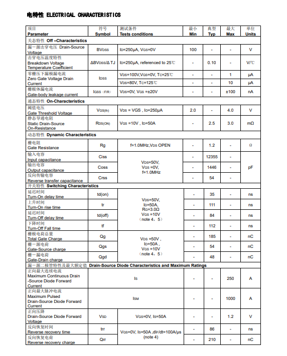 以飞虹半导体250N1F2A为例,这款SGT工艺MOS管在DC-AC逆变器中表现突出。其静态导通电阻低至2.5-3.0mΩ(VGS=10V),结合185nC的栅极电荷总量,能显著降低开关损耗,提升逆变效率。对比进口型号如英飞凌IPP030N10N3G,该产品在动态特性上具有兼容性,例如栅电阻1.2Ω与输入电容12355pF,确保驱动电路平滑过渡,避免兼容性问题。